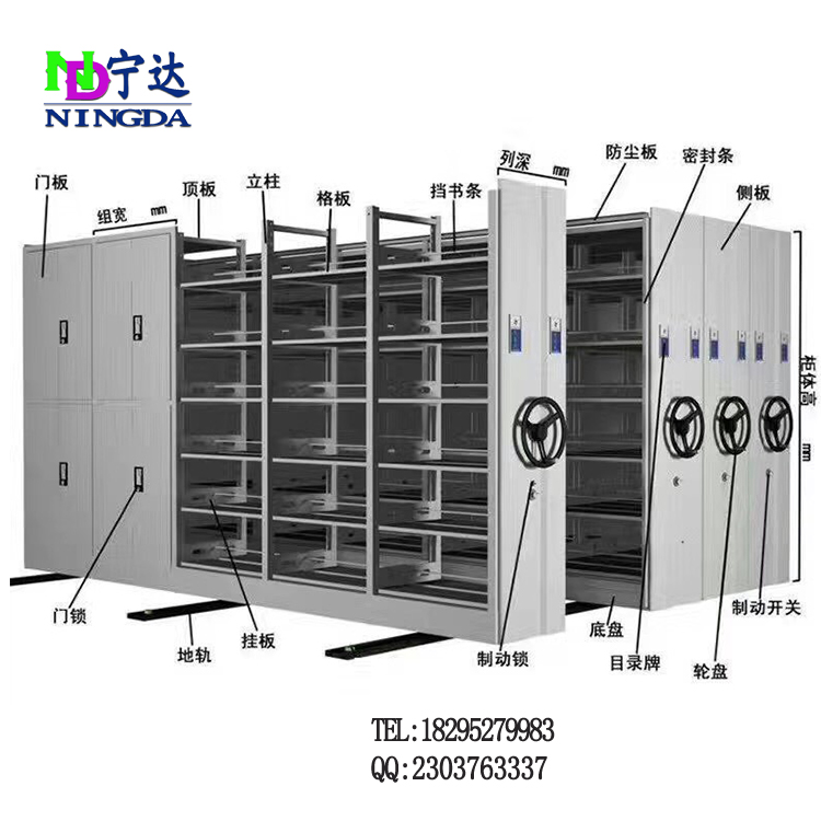 2、密集架由正反上中下護板,起支撐作用的立柱、擺放檔案資料的擱板、門板、搖把系統、底盤系統、傳動系統、防塵系統組成。